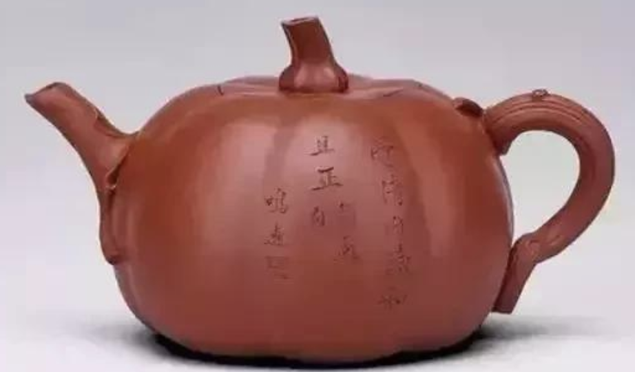 壺作七棱腹,卷葉成流,流口一任天然,瓜藤作壺柄,曲折精巧,瓜梗作蓋鈕,掘中空而顯秀巧,南瓜造型活靈巧現(xiàn),渾然天成。一面刻“骨清肉膩和且正,摘蘇句。鳴遠(yuǎn)”并鈐“陳鳴遠(yuǎn)”篆書籍鈐記。書籍法銘時髦健,有晉唐人作風(fēng),印鑒與天津藝術(shù)博物館所躲《陳鳴遠(yuǎn)制天雞壺》相通。